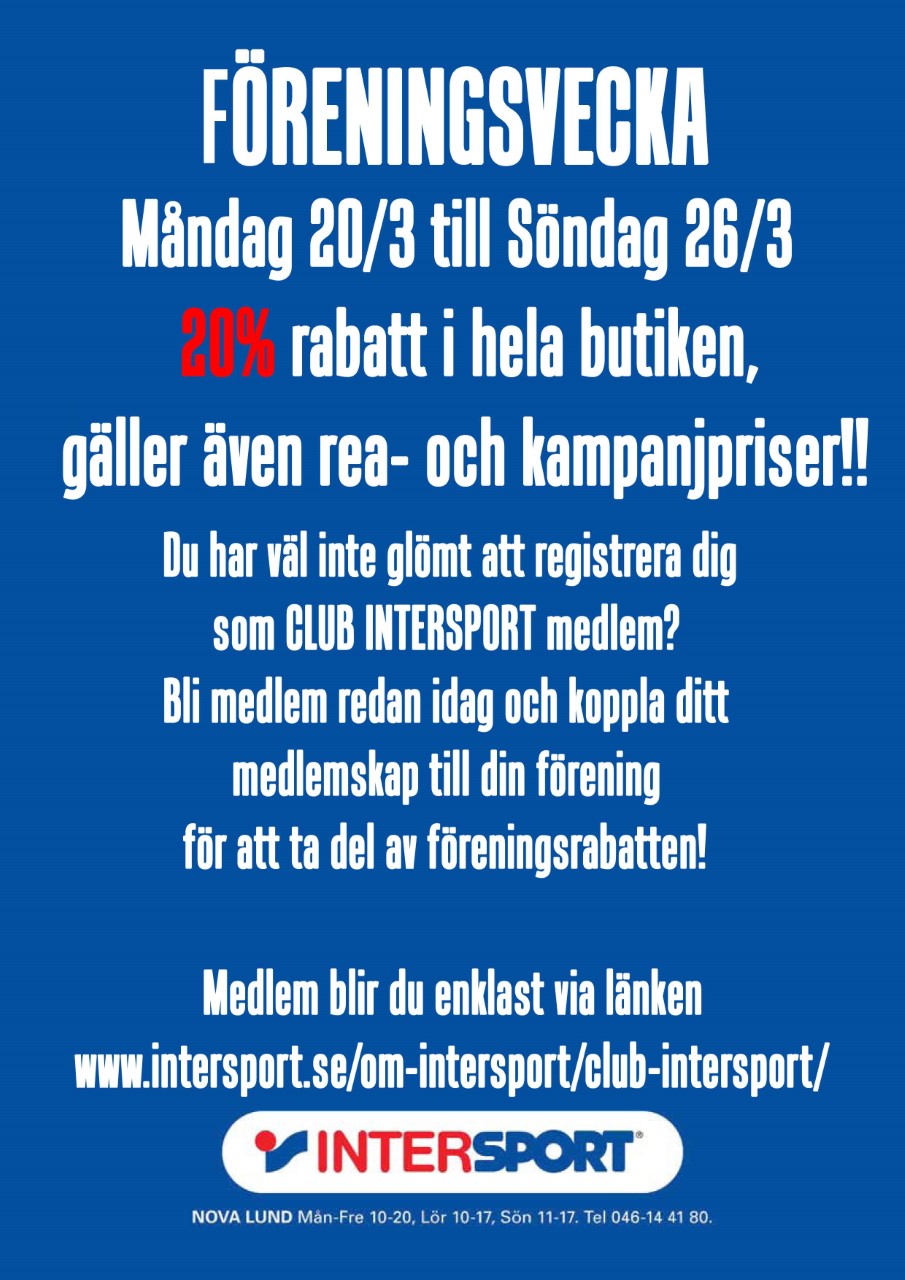 Måndag den 20 mars till söndag den 26 mars (v.12) är det föreningsvecka hos Intersport Nova Lund med 20% rabatt i hela butiken.