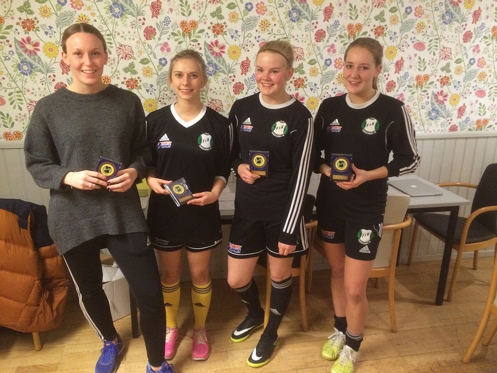 75 spelade matcher för Lina, Ellinor, Johanna och Maja. Ida och Amanda W saknas på bilden.